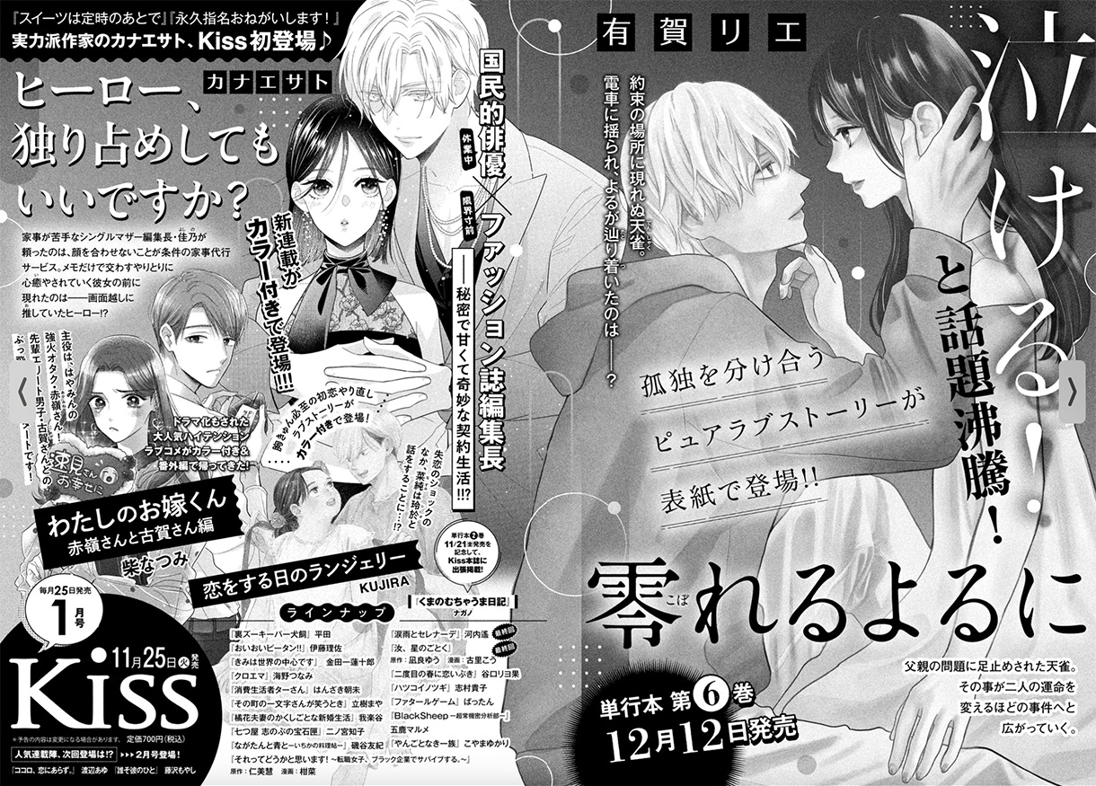 Kiss12月号本日発売!! 表紙はドラマ第2期決定!!の『ながたんと青と』(磯谷友紀)!! 衝撃展開の嵐…!!『やんごとなき一族』(こやまゆかり)は巻頭カラー付き!!